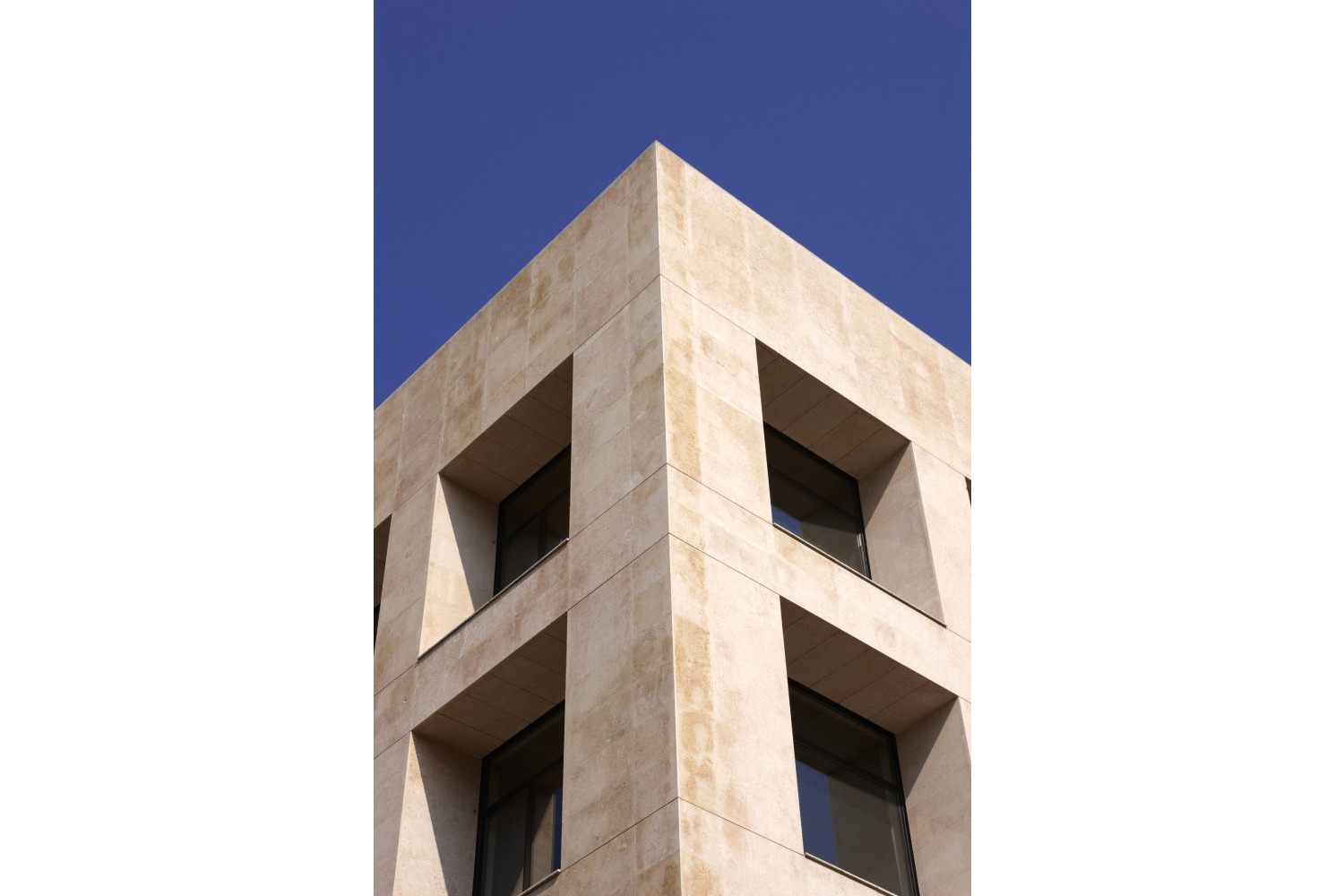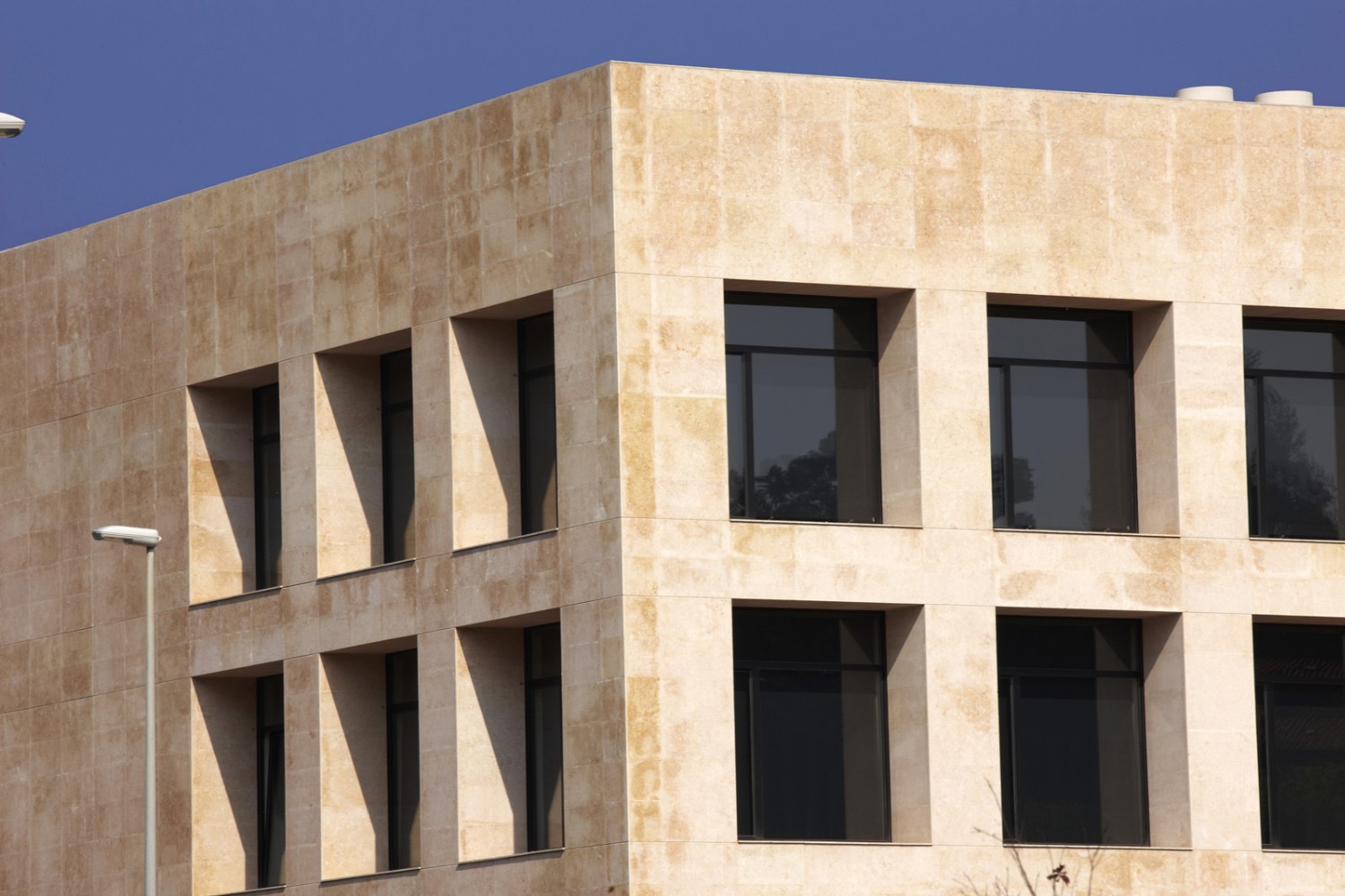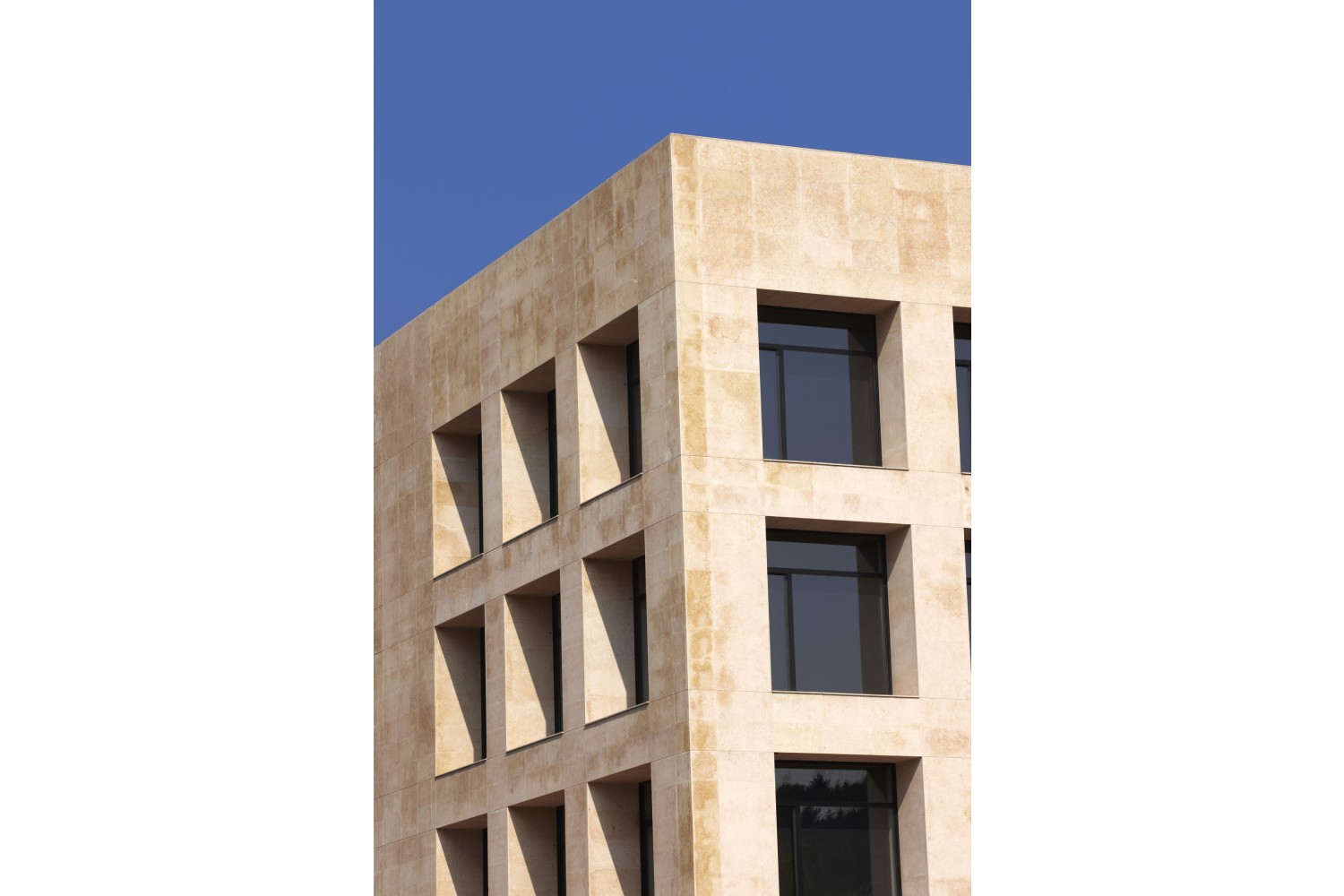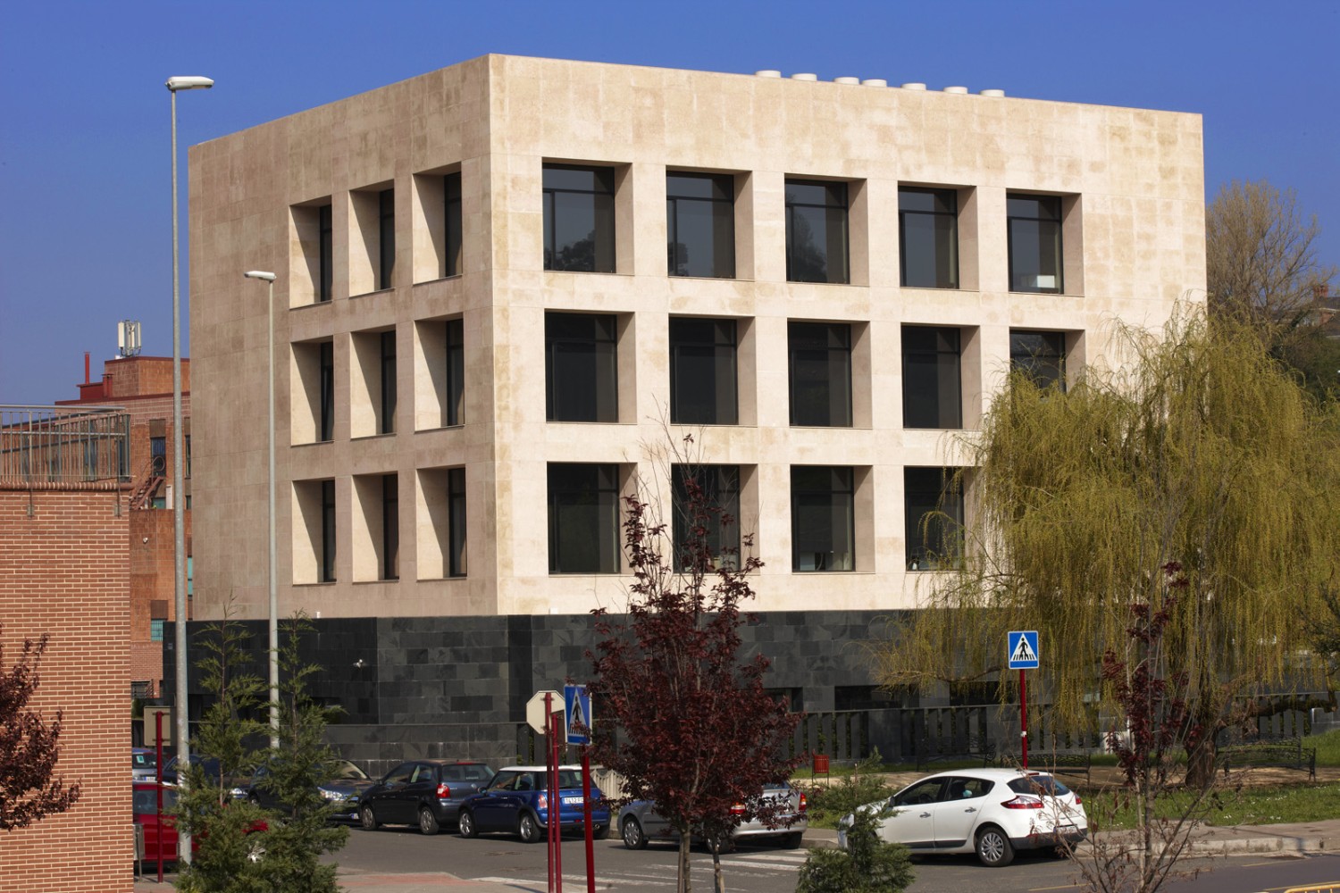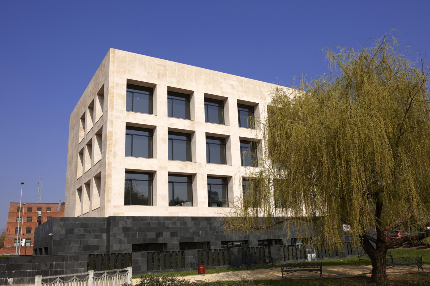 En vez de apostar por una solución de muro cortina, se proyecta un edificio formado por un basamento de pizarra y un cubo de tres planta con grandes huecos dispuestos uniformemente. Para darle más peso al volumen superior se retrasan las carpinterías, formando unas mochetas de gran anchura para crear la sensación de huecos horadados en un sólido. Para dar mas énfasis a esta sensación la entrada al edificio se produce justo bajo este volumen por una de sus esquinas, que vuela sobre el basamento de pizarra negra.