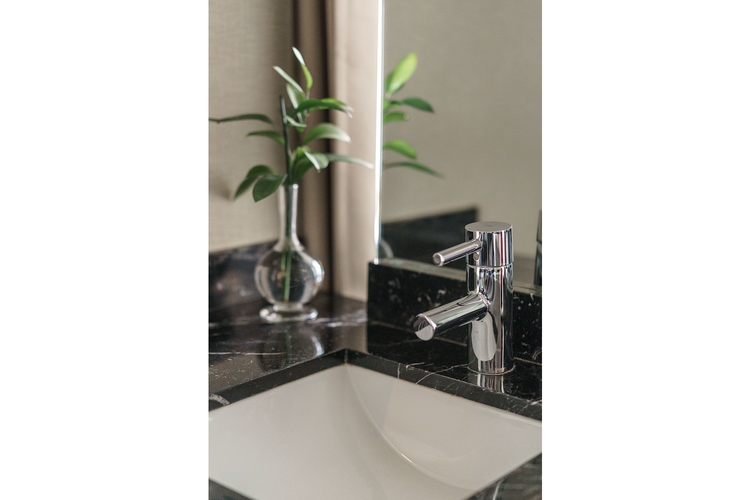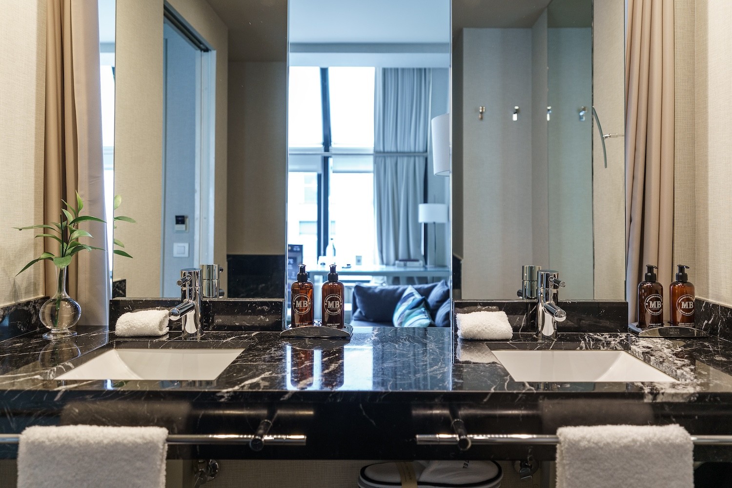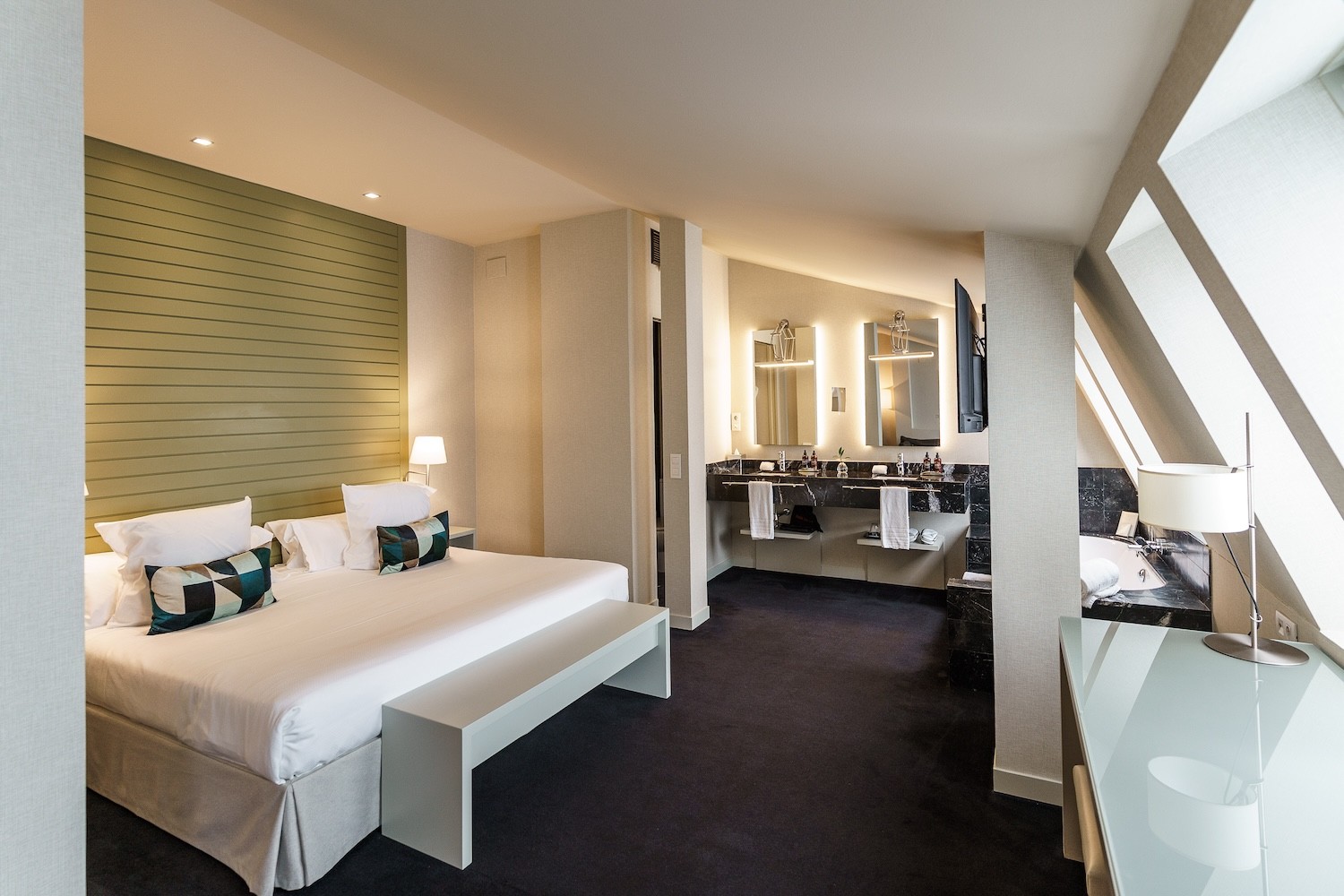En las habitaciones se han combinado varios colores dependiendo de la luz de cada habitación, además de tomar como referente el color base elegido por Miró para todo el hotel. En los cuartos de baño se ha mantenido el mármol Marquina, de característico color negro veteado de hilos blancos.