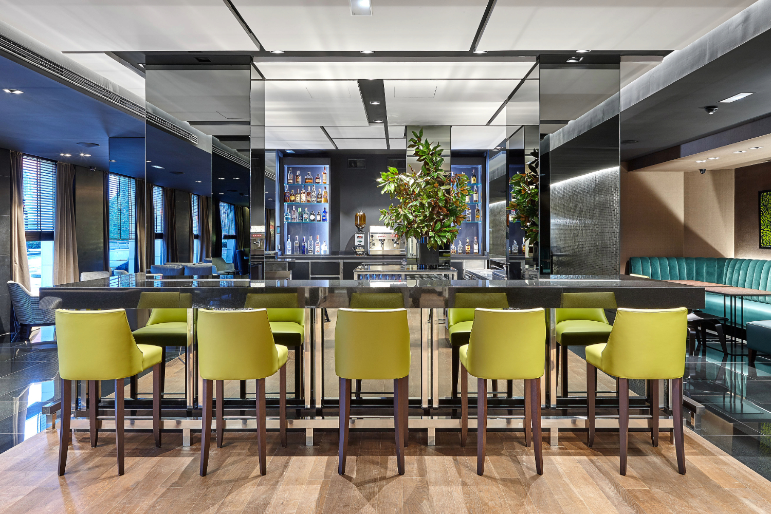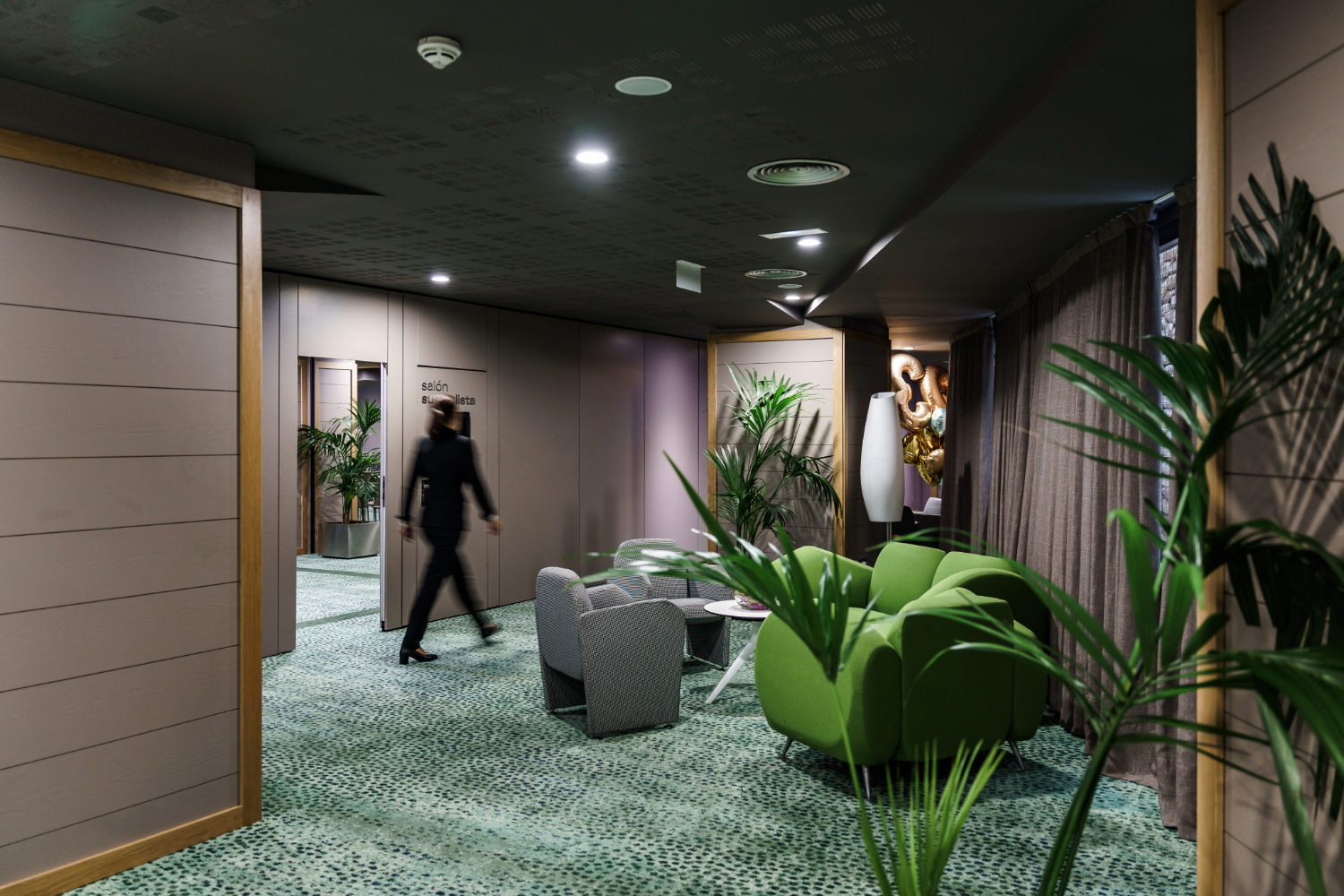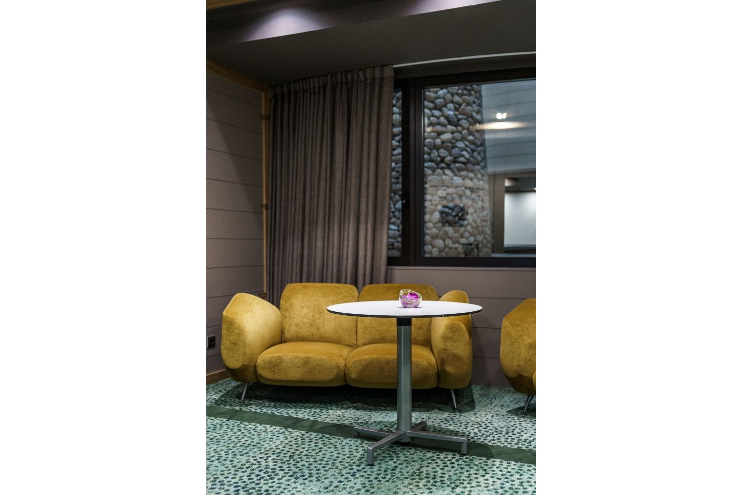 El ciprés de piedras de la entrada gana aún mayor presencia al instalar justo debajo un estanque de agua que refleja su imponente silueta. La cascada prolonga su camino hasta la entrada posterior del hotel mediante canales que desembocan en otro estanque con un olivo en el centro que da la bienvenida a los clientes. Además, al vestíbulo se añadió la hipnótica instalación cinética, compuesta por manecillas del reloj, A Million Times, del estudio sueco Humans since 1982. La nueva recepción, diseño de Foraster Arquitectos, combina diferentes acabados de granito para dar una continuidad de materiales a todo el conjunto.