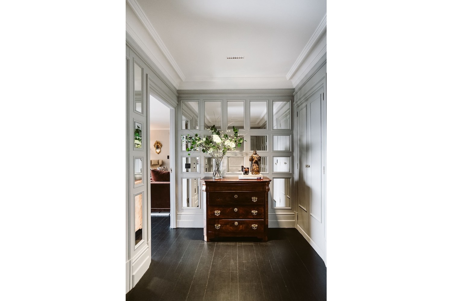 Trabajo de interiorismo en el barrio de Neguri (Getxo), en el que se mantiene la distribución original y se parte de una buena base de empanelados y mobiliario de los propietarios. Se ha actualizado la decoración subiendo los empanelados hasta el techo, además de incluir espejos en el hall para aportar luz e introducir una nueva biblioteca en el comedor.